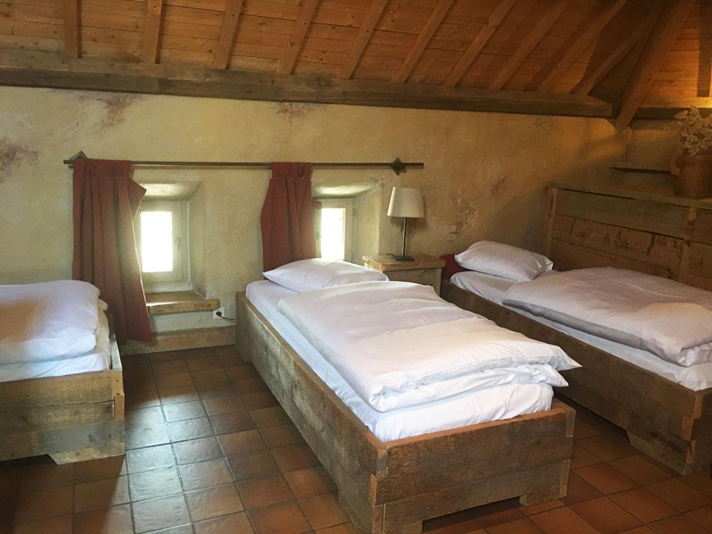 - 1 Zimmer: 5 Personen (Einzelbetten), TV, privates Duschbad mit Waschbecken + WC (über einen externen Übergang erreichbar)
