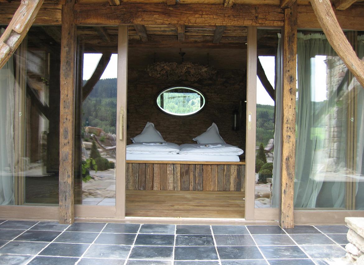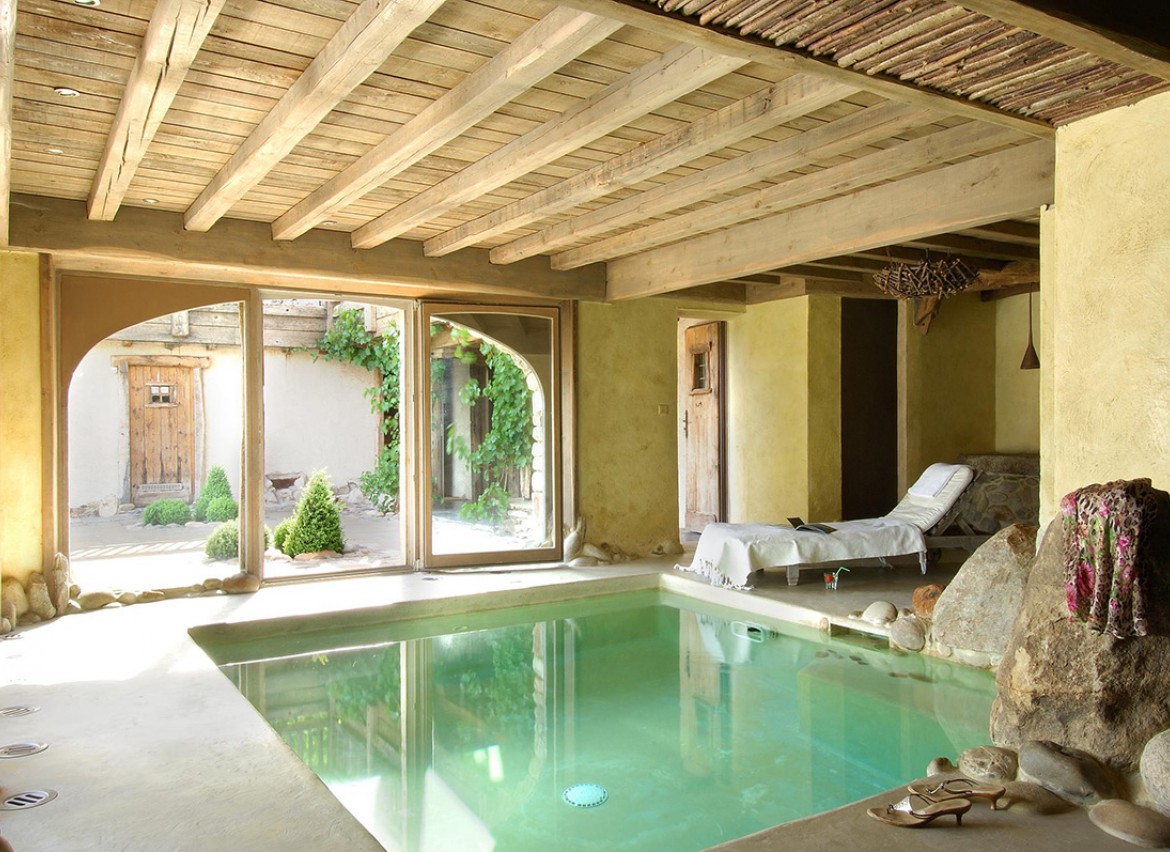 - Espace détente intérieur : piscine, douches, coin de relaxation et espace bar avec pompe à bière